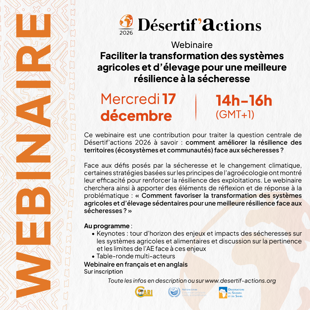 Retour atelier préparatoireLe webinaire « Faciliter la transformation des systèmes agricoles et d’élevage pour une meilleure résilience à la sécheresse » aura lieu mercredi 17 décembre de 14h à 16h (GMT+1) sur zoom, sur inscription