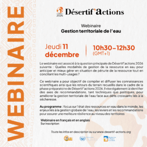 Désertif'actions 2026, InscriptionLe webinaire « Gestion territoriale de l’eau» aura lieu jeudi 11 décembre de 10h30 à 12h30 (GMT+1) sur zoom, sur inscription