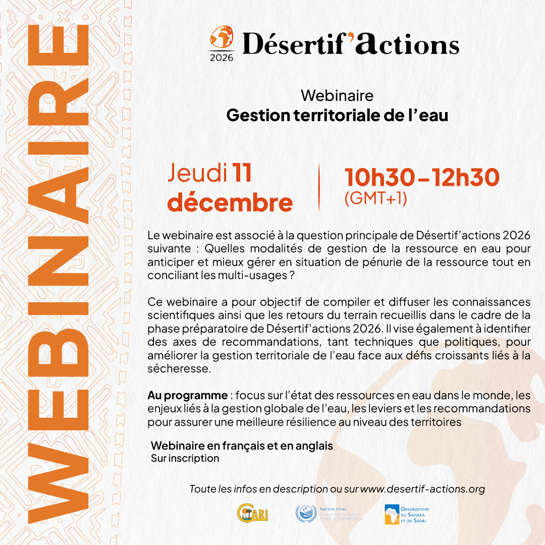 Le webinaire « Pilotage des territoires : faciliter le rôle des collectivités locales pour la résilience à la sécheresse dans les territoires » aura lieu mardi 16 décembre de 14h à 16h (GMT+1) sur zoom, sur inscription