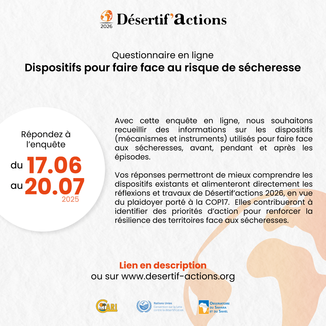 Désertif'actions 2026, InscriptionDu 17 juin au 20 juillet 2025, participez à notre enquête sur les « Dispositifs pour faire face au risque de sécheresse ». La phase 1 – préparatoire du Sommet International continue ! Après le démarrage des ateliers préparatoires dans de nombreux pays, (les premiers ateliers commencent dès ce mois de juin !), nous profitons de la Journée mondiale de lutte contre la désertification et la sécheresse pour lancer notre enquête en ligne sur les questions de sécheresse !