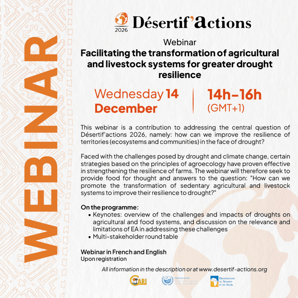 The webinar “Facilitating the transformation of agricultural and livestock systems for greater drought resilience” will take place on Wednesday 17 December from 2pm to 4pm (GMT+1) on Zoom. Registration is required.