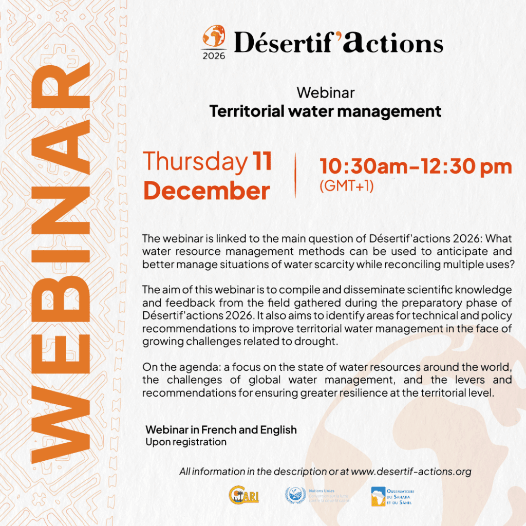 The Désertif’actions 2026 webinars are a major step forward in taking stock of scientific knowledge, the experiences of operators in the field gathered during preparatory workshops, and the challenges of the various themes in terms of advocacy. The four webinars will thus contribute to enriching discussions on the resilience of territories to drought and preparing for the Désertif’actions 2026 summit, which will be held from 25 to 28 March in Djerba (Tunisia).