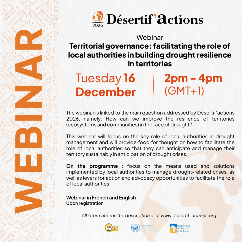 This webinar is organised as part of the 6th edition of Désertif’actions (D’a), which aims to foster multi-stakeholder dialogue and develop advocacy tools on the following issue: how can we improve the resilience of territories (ecosystems and communities) in the face of drought?