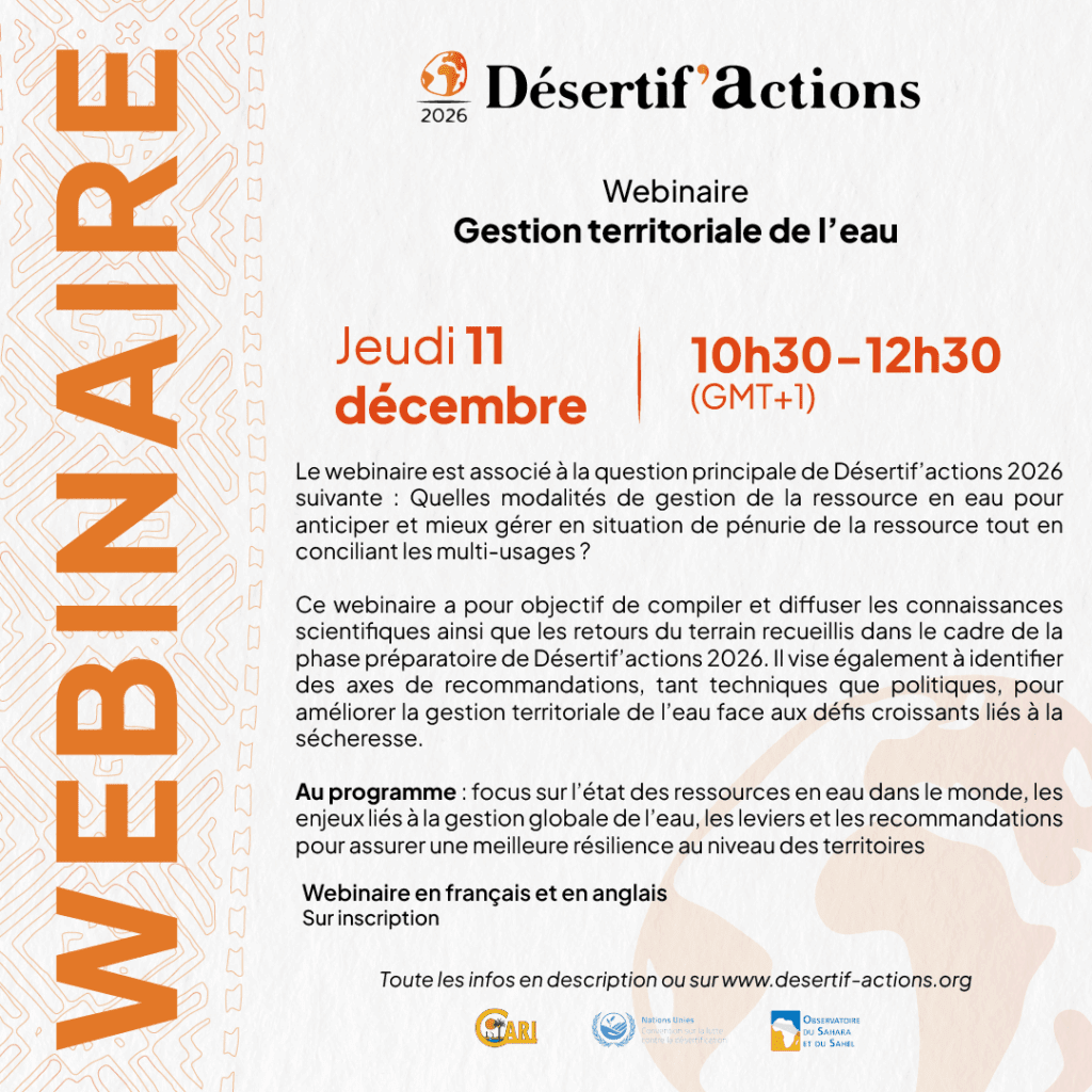 Les webinaires de Désertif’actions 2026 sont une étape majeure permettant de faire le point sur les connaissances scientifiques, sur les expériences des opérateurs sur le terrain recueillis dans les ateliers préparatoires et sur les enjeux des différentes thématiques en termes de plaidoyer. Les 4 webinaires viennent ainsi contribuer à enrichir les discussions sur la résilience des territoires à la sécheresse et de préparer le sommet Désertif’actions 2026 qui se tiendra du 25 au 28 mars à Djerba (Tunisie).