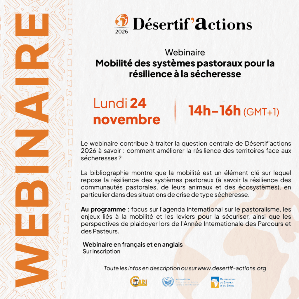 Le webinaire « Mobilité des systèmes pastoraux pour la résilience à la sécheresse » aura lieu lundi 24 novembre de 14h – 16h (GMT+1) / 13h – 15h (GMT) sur zoom, sur inscription